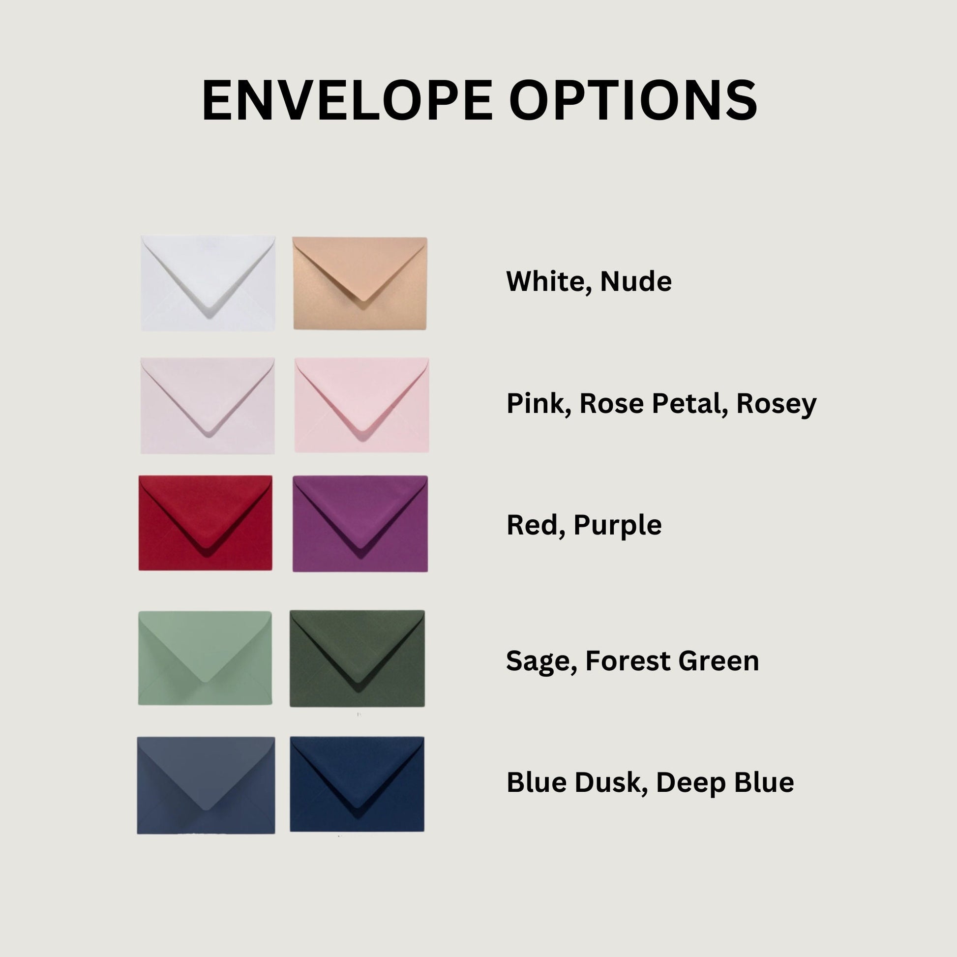 Choose from an array of hues to match the mood and style of your wedding. From classic whites to bold and bright tones, our envelopes are designed to complement your selected cards seamlessly.