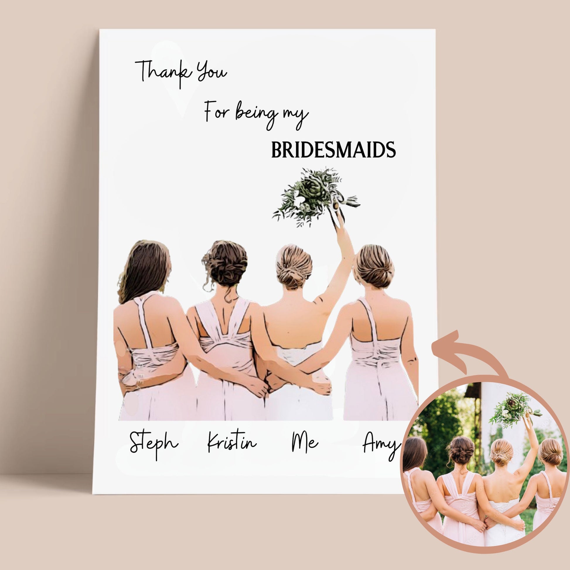 Personalized Illustration: Send us your favorite photo from your wedding day featuring your bridesmaids, and we'll handcraft a stunning illustration capturing the joy and camaraderie of the moment.