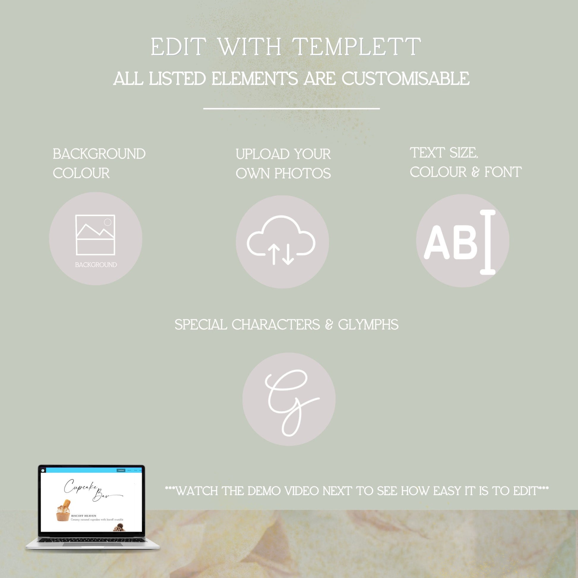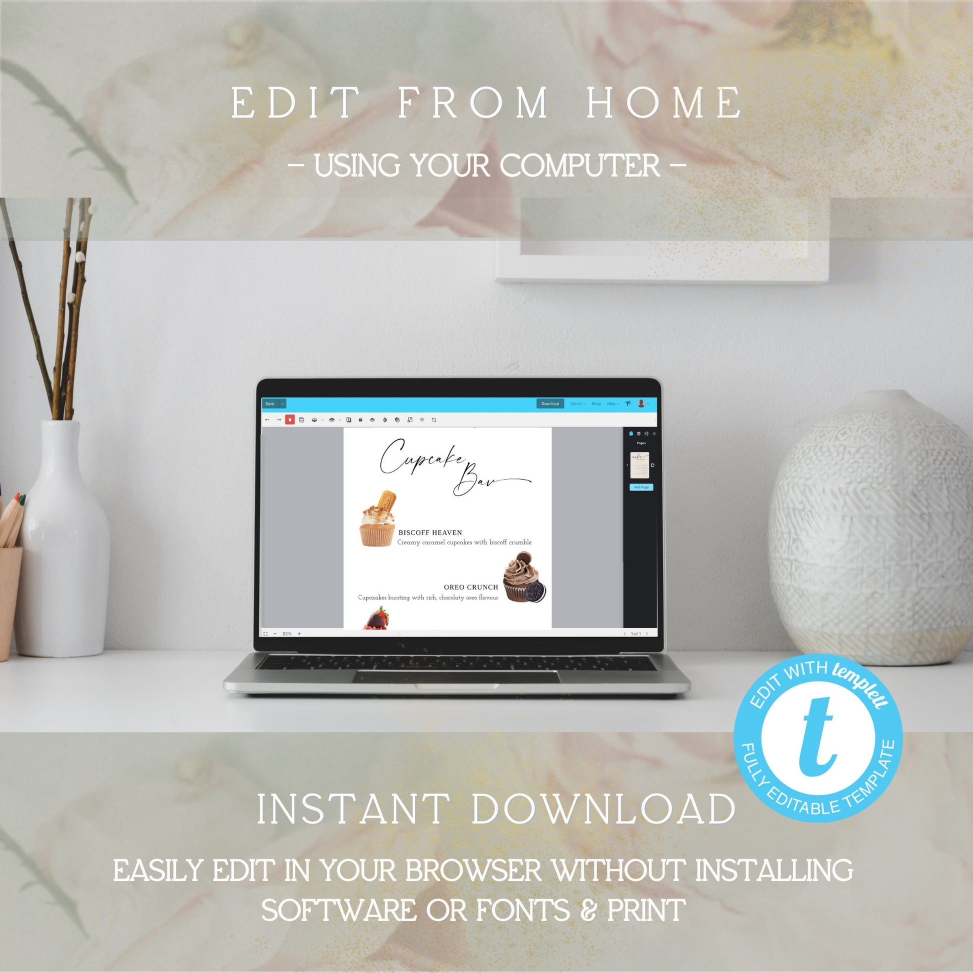 This is an instant download digital template that you can fully edit in your browser on Templett.com. Templett.com is an online graphic design tool that allows you to self edit and customize the design, adding your own information. You can print at home or professionally. The design comes with over 20 pre-made cupcakes and over 50 elements for you to make your own cupcake designs. If there are any elements missing that you would like for your cupcakes please feel free to contact me and I can add them free of charge.