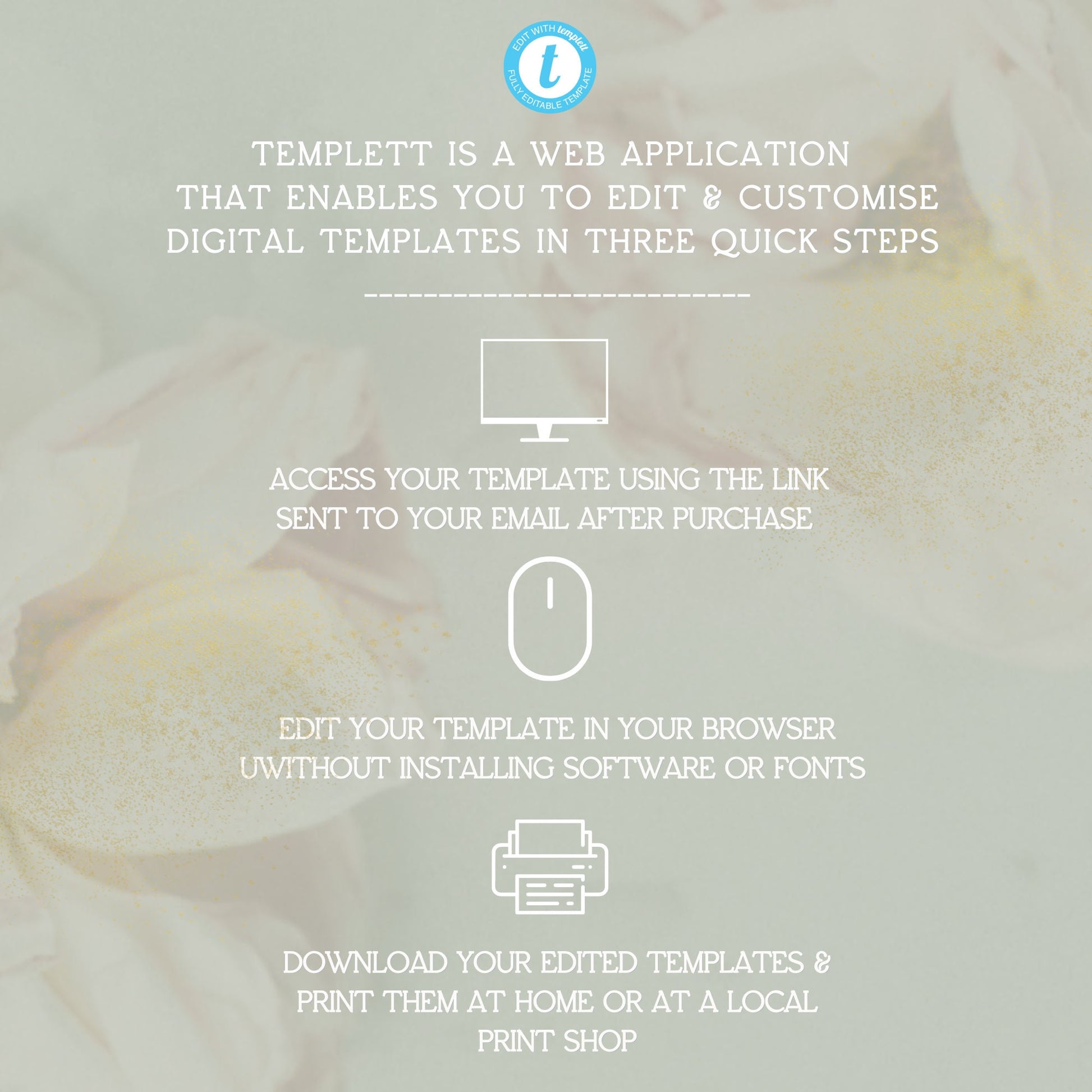 ❶ Within a few minutes after your purchase, an email from Templett.com with a link to access your template will be sent to the email associated with your Etsy account. (be sure to check your spam folder) You can also go directly to Templett.com and use your order info to login and access your purchased items.