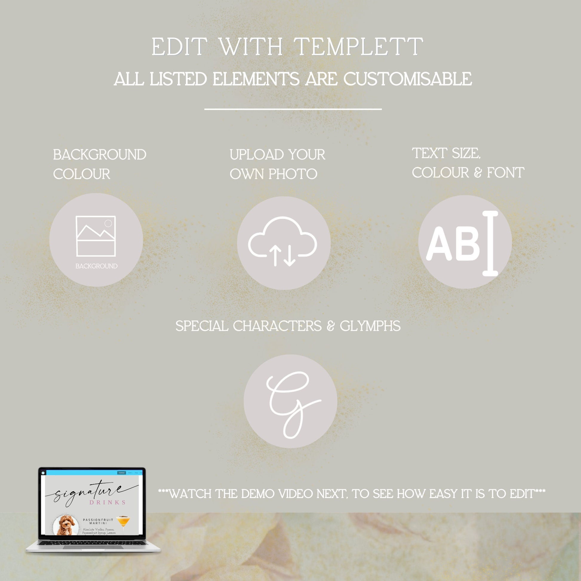 Weddings are all about the little details that make your day unique. This printable wedding sign is perfect for your wedding day to let guests know the delicious cocktails you have on offer. This listing is an Instant Download digital file for you to edit right in your web browser with Templett after purchase. (You can edit the sign and write anything you would like.) Templett is a fully customizable template editor that allows you to personalize your printable directly in your web browser. All you need to do is Purchase > Personalize > Print!