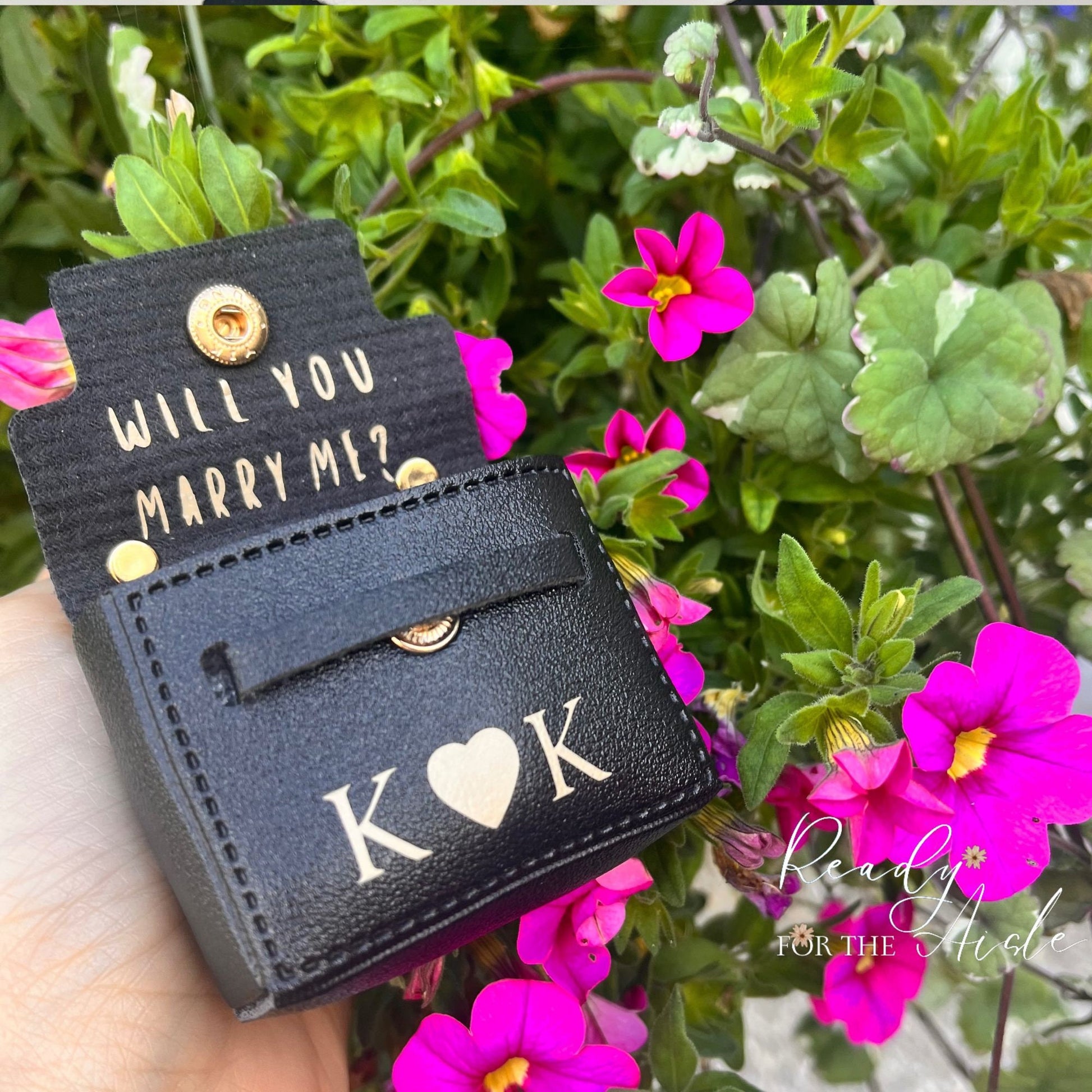 You can add a personal touch to your ring holder by adding your proposal date or initials to the front of the pouch for free. You can add your 'date' or 'initials' when you are placing your order. If you would also like to add a special proposal message on the inside this is also included. Write a cute hidden message to your partner-to-be and keep after as a proposal memento or reuse the box if you plan to also have your pet carry your rings down the aisle.