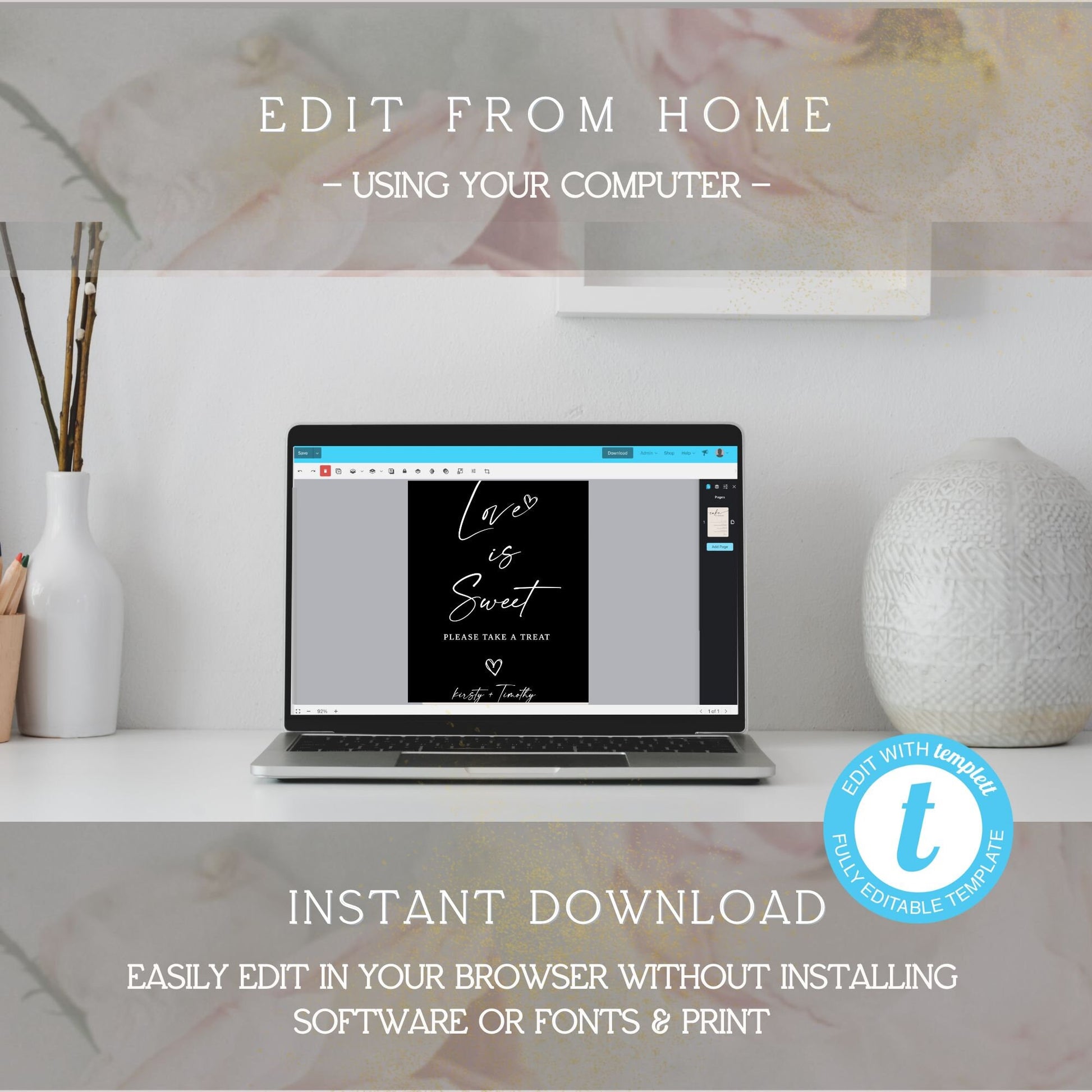 Weddings are all about the little details that make your day unique. This printable wedding sign is perfect for your wedding day to let guests know to help themselves to all the sweets and treats you have on offer, from candies to donuts or s'mores - the choice is yours. The template features a script-style font and a heart, making it stylish and contemporary. This listing is an Instant Download digital file for you to edit right in your web browser with Templett after purchase. (You can edit the sign and write anything you would like.) Templett is a fully customizable template editor that allows you to personalize your printable directly in your web browser. All you need to do is Purchase > Personalize > Print!