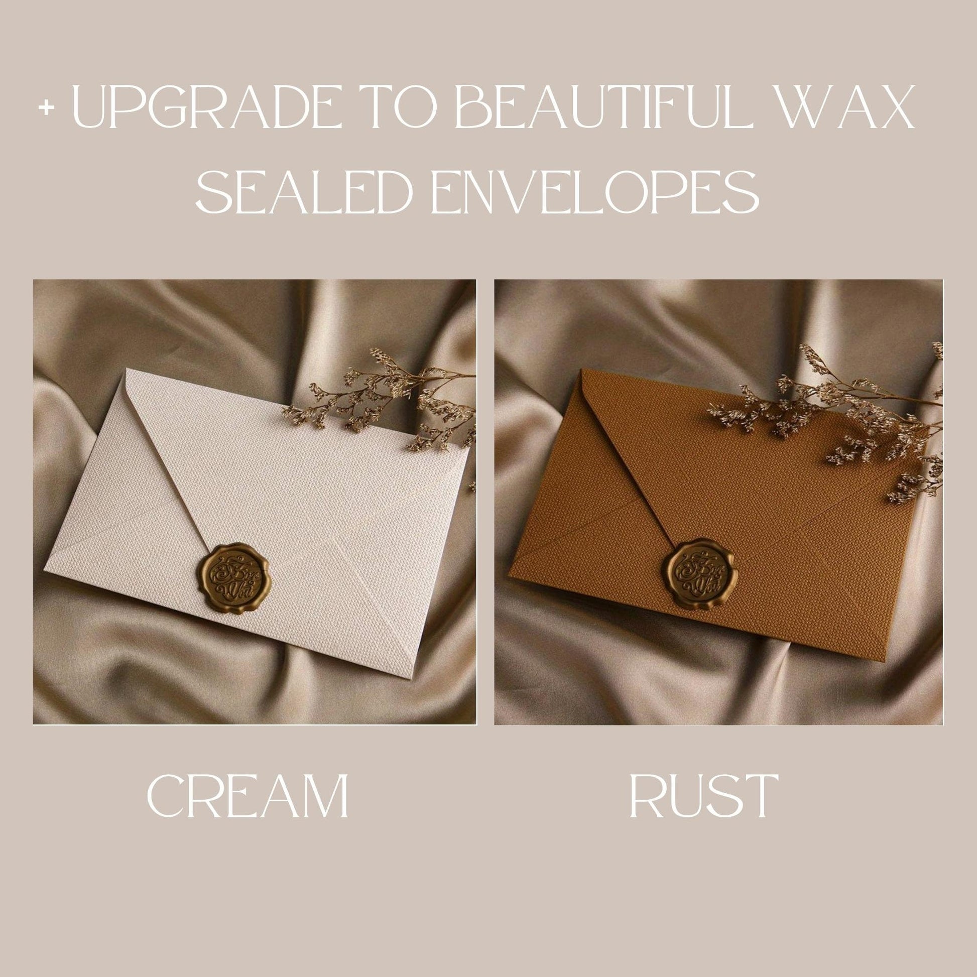 Our save the date cards come with high quality white envelopes as standard or the can be upgraded to our Linen Woven Envelopes with wax seals. See Envelope options in our listing photos.