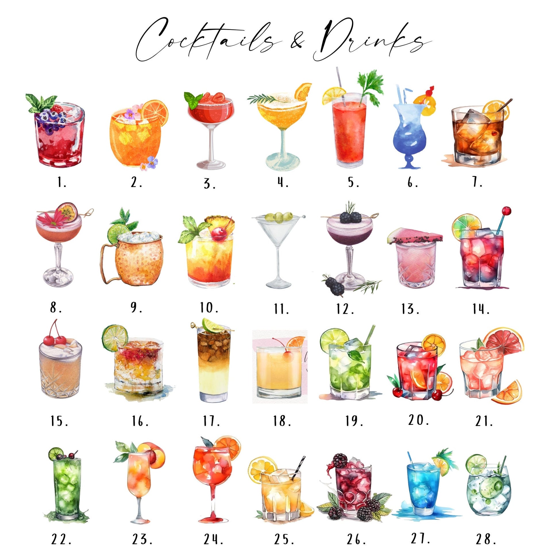 Select your drinks from our collection of over 50+ beverages. If your drink choice isn't available please just message us and we can make you the drink illustration free of charge.