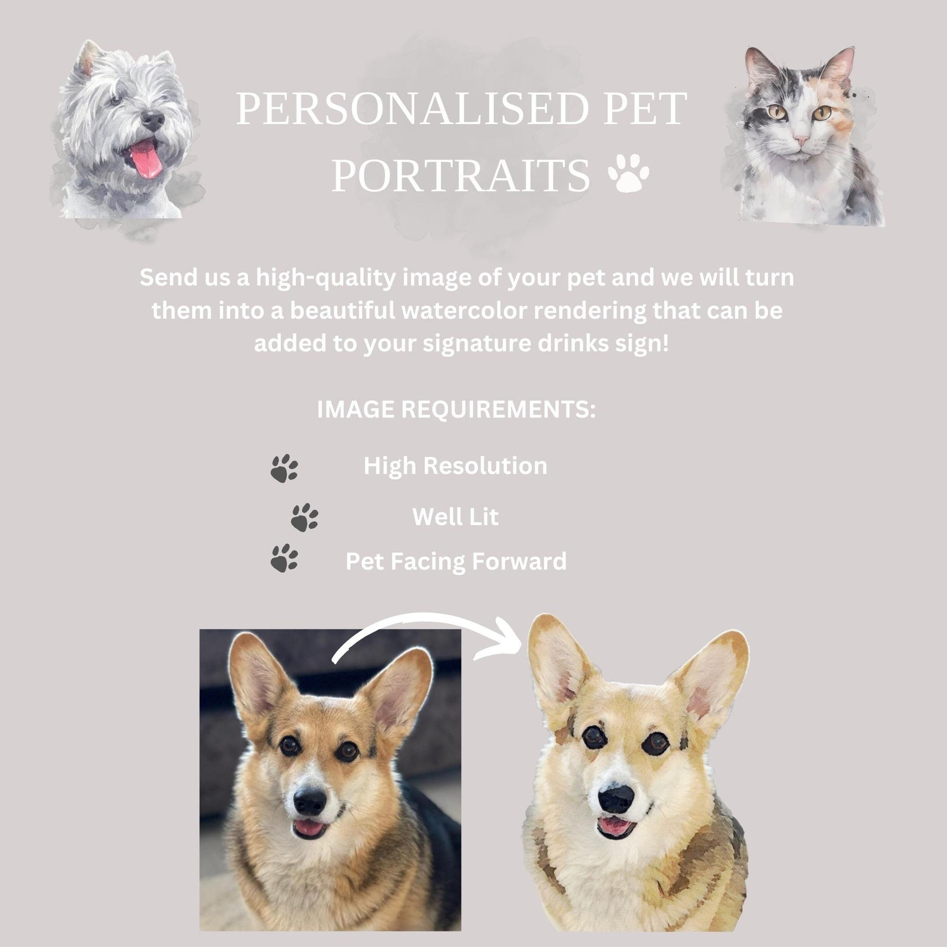 Choose from our collection of carefully curated watercolor dog breeds or alternatively share a delightful snapshot of your pet with us, and we'll turn it into an artistic watercolor masterpiece! We also can create watercolor renders of cats too!