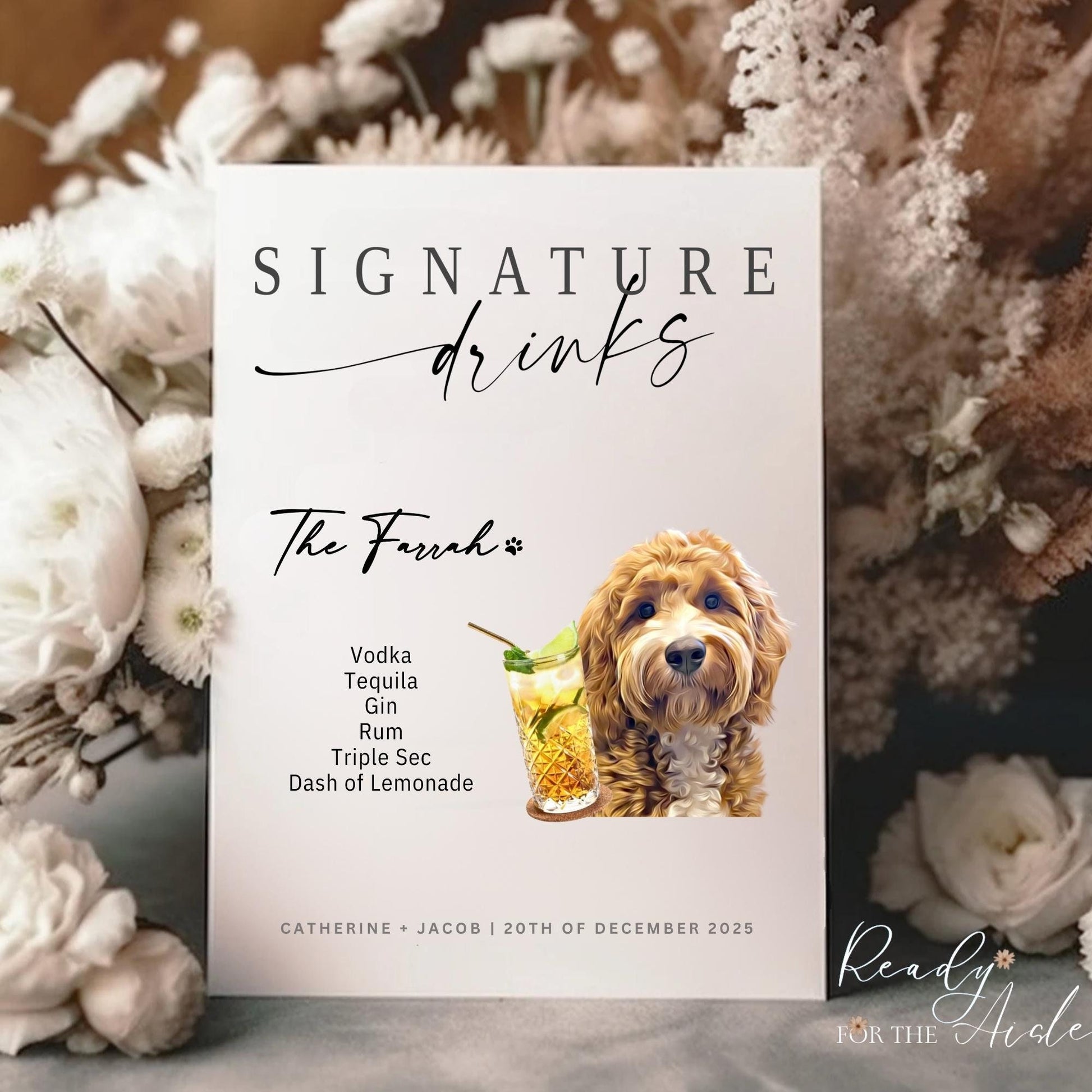 Looking to add a dash of tail-wagging excitement to your wedding or party? Look no further! Introducing the perfect signature drink sign that'll set tails wagging and hearts swooning at your special event. Say hello to our one-of-a-kind wedding reception bar sign featuring none other than your favorite four-legged friend! š¾