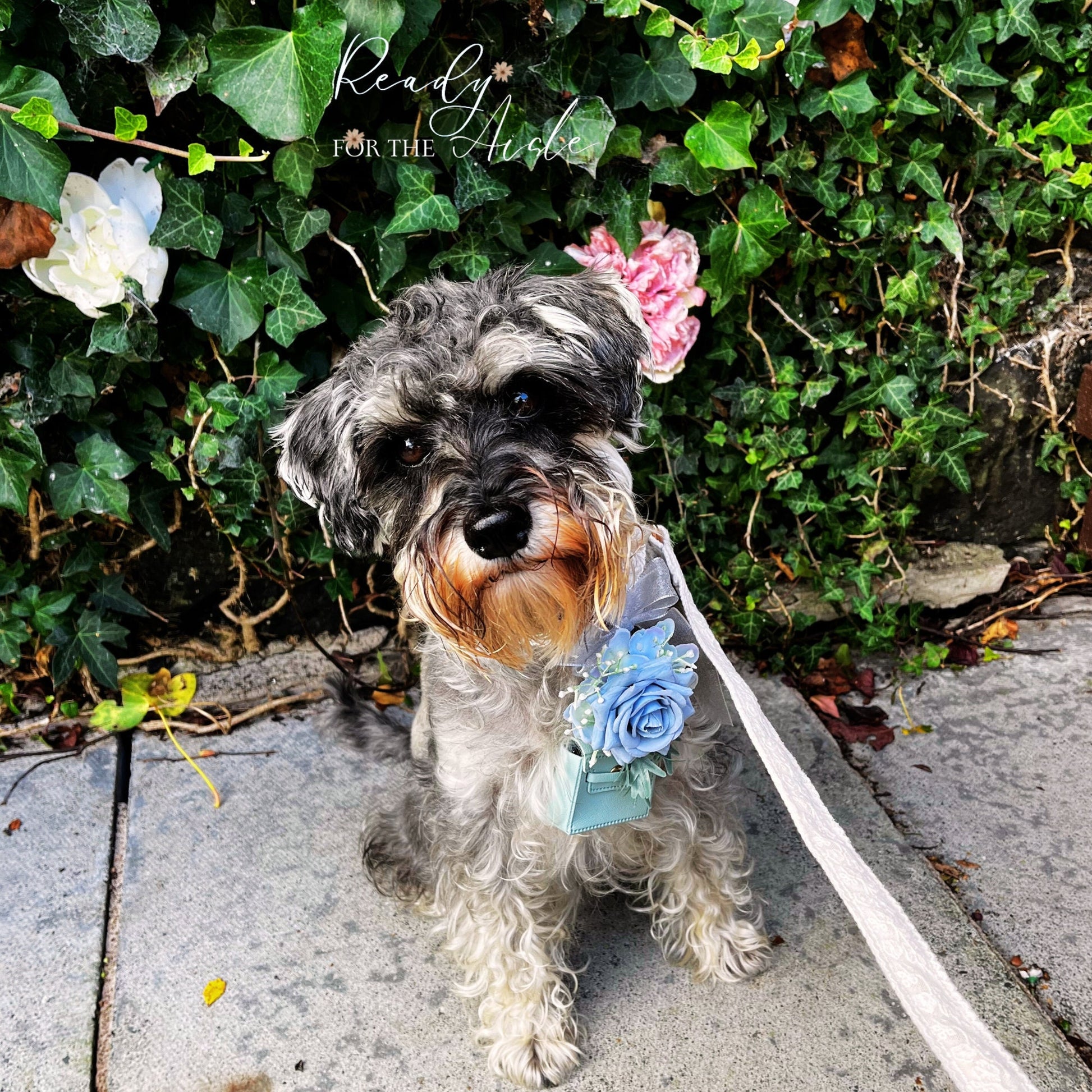 Description: Make your wedding day even more special with this complete, elegant set featuring an Ivory Lace Dog Collar with a delicate Blue Flower Corsage, a matching Ring Bearer Box that can be personalized with your custom text, and a coordinating Lace Lead. Perfect for including your furry friend in your ceremony, this set ensures your dog looks as charming as they are comfortable while they walk down the aisle.