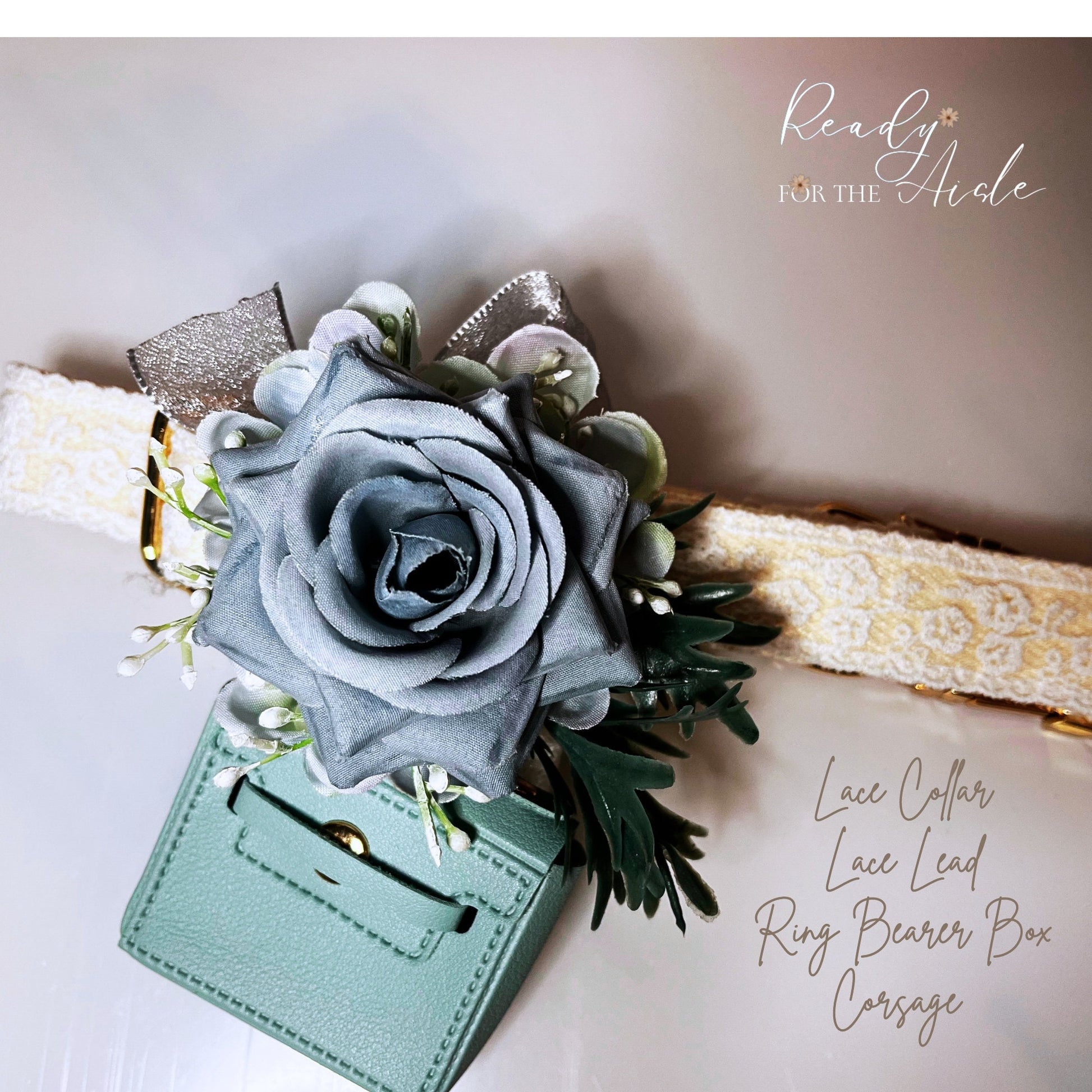 Ivory Lace Dog Collar with Blue Flower Corsage, Matching Ring Bearer Box & Lace Lead | Dog Collar with Flower